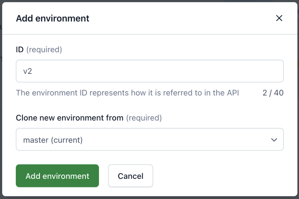 Having access to these multiple environments is what allows us to make a seamless data migration. In your current space you should already have one environment, something like “master”. To add a new environment, go to “Settings” in the top right corner and then select “Environments” from the dropdown. Next click “Add environment”. This should open a popup which asks you to name the new environment and also asks where you want to copy the new environments data from: