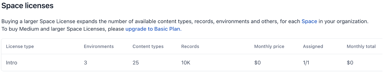 Fortunately, Contentful offers a very generous free “Intro” space license. Under the Intro license we are allowed three environments.